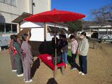 12月10日(水)の3・4校時に、6年生が社会科の室町文化の体験学習として、茶道体験を行いました。今年度は、移動茶室を使って、本格的につくばいで手を洗い、躙り口から茶室に入ってお抹茶をいただきました。