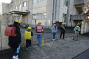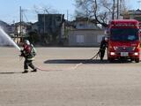 12月12日(金)に、火災を想定した避難訓練を実施しました。児童は、落ち着いてベランダから避難することができました。その後、水消火器を使った消火訓練、消防車による放水実演がありました。