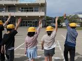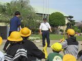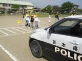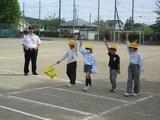 ○後半は、校庭に準備した模擬道路を使って、実際の歩行、横断について練習しました。出流原駐在所のお巡りさんにご指導いただき、何度も実践することができました。
